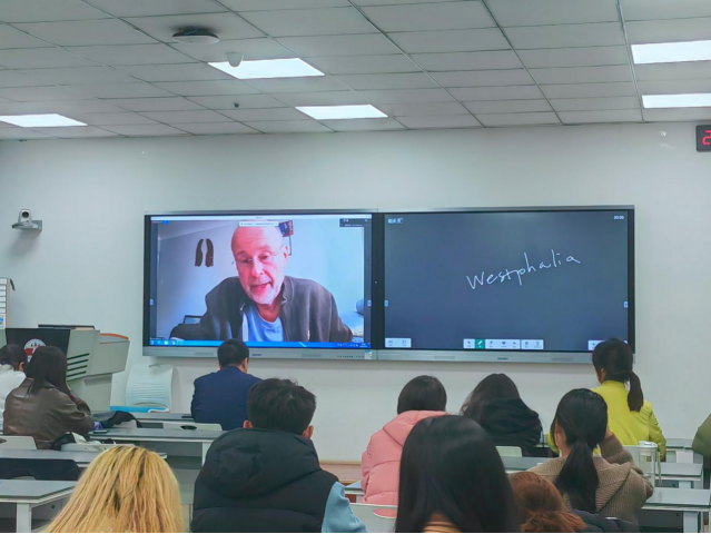2023年11月9日19时30分,国际法学院在五号教学楼202教室共同为我校涉外班同学组织安排了一场国际法方面的线上学术讲座。本场讲座由国际法研究院(日内瓦)院士、爱沙尼亚塔林大学教授、前英国伦敦大学国王学院教授、前爱沙尼亚外交部第一副部长、西北政法大学丝绸之路区域合作与发展法律研究院荣誉研究员和学术顾问瑞纳•穆勒森教授 (Rein Müllerson)主讲,国际法学院副院长潘俊武教授进行了现场翻译,国际法学院涉外班学生聆听了讲座。