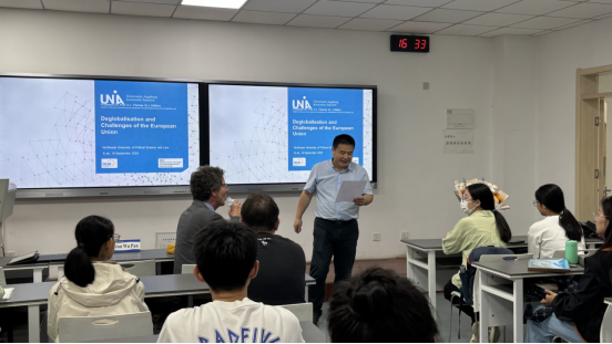 Thomas Möllers教授从欧盟一体化历史切入,梳理了从1951年《巴黎条约》到2009年《里斯本条约》的关键节点,强调欧盟作为“和平联盟”“经济联盟”与“法律联盟”的多重属性。关于欧盟制度架构,默勒斯教授详细解析了欧盟理事会、欧洲议会、欧盟委员会等七大机构的职能分工,并以欧洲议会“共同决策程序”为例,说明成员国与超国家机构的立法权力平衡。此外,以“去全球化”为核心切入点,结合近年国际政治经济格局变化,系统分析了该趋势对欧盟的多重影响。他指出,近年来英国脱欧、新冠疫情、地缘政治冲突等多重因素加速了去全球化进程,这对以多边主义为基础的欧盟带来了前所未有的挑战。教授特别强调,尽管面临重重挑战,但经济全球化仍是未来发展之潮流。