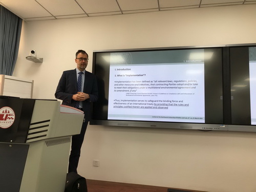 2019年3月25日早上,德国汉堡大学教授Alexander Proelss应国际法学院的邀请莅临我校,在长安校区5号教学楼302教室为我校师生做了题为《海洋法及其实施》的讲座。讲座由国际法学院副院长潘俊武教授主持,参加人员包括国际法学院教师常虹博士以及各专业的研究生和本科生。讲座结束后,潘俊武副院长与Proelss教授探讨了进一步合作的思路并代表学院赠送了学院纪念品。