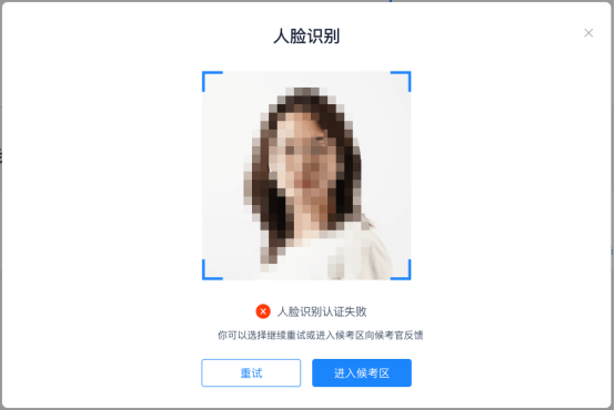 d. 系统对接公安部数据,若认证成功可进入候考区,若认证失败可点击“重试”。若一直认证失败也可进入候考区,但在考官界面会提示“人脸识别认证未通过”,考生须将身份证原件在面试中展示给考官,进行“人证对比”。考试过程中,考官可以查看人脸识别时的截图,确保面试考生是参加人脸识别考生本人,避免替考。