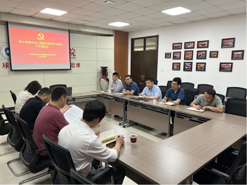 6月16日,国际法学院党委于格物楼一层会议室召开深入贯彻中央八项规定精神学习教育工作推进会,学院领导班子成员、教研室主任、全体党支部书记参加会议。学院党委书记李立主持会议。
