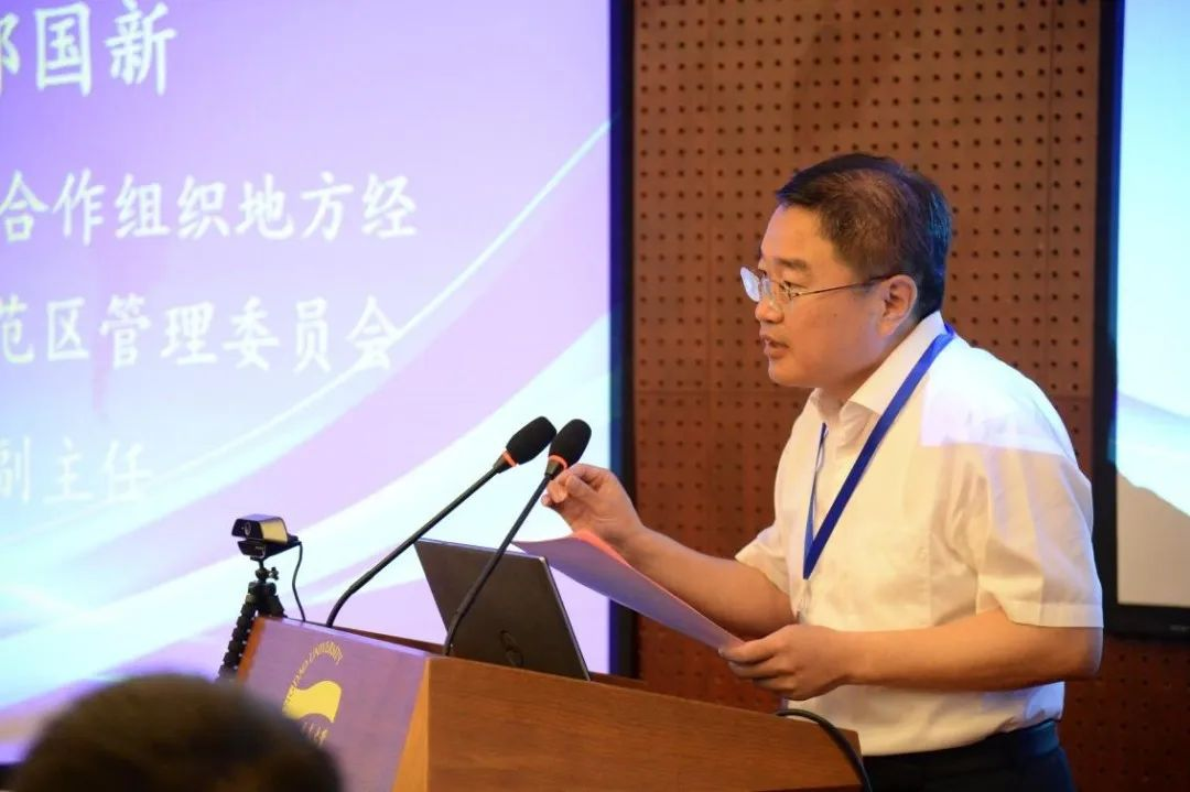 中国-上海合作组织地方经贸合作示范区管委会副主任郝国新在致辞中介绍了中国-上海合作组织地方经贸合作示范区的建设情况,尤其是在推进“四个中心”和上合组织经贸学院建设中取得的成绩。