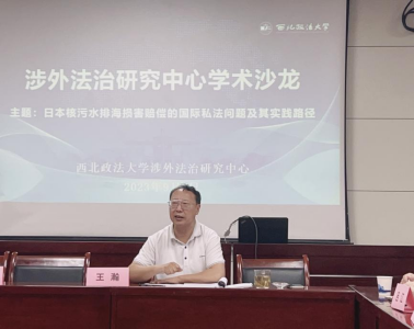 2023年9月9日晚,涉外法治研究中心在雁塔校区研究生综合楼三楼国际法研究中心报告厅举办“日本核污水排海损害赔偿的国际私法问题及其实践路径”专题学术沙龙。中国国际私法学会副会长、涉外法治研究中心执行主任王瀚教授担任引导性发言人,国际法学院副院长潘俊武教授担任主持人,国际法学院翁杰教授、刘萍教授、王泽林教授、吕江教授、周亚光副教授、张丝路博士、蒋围博士、张光耀博士担任与谈人,国际法专业博士研究生、硕士研究生及本科生共50余人参加沙龙。