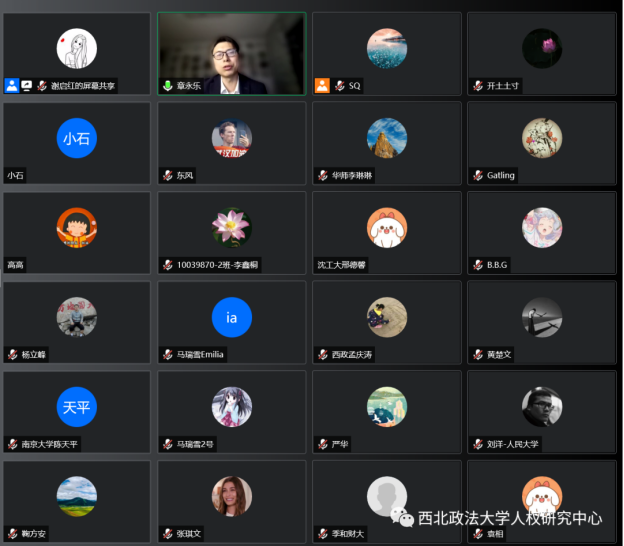 2022年4月23日,第27个世界读书日,由人权研究中心主办,政治与公共管理学院、国际法学院、 教师发展中心、发展规划与学科建设处协办的“公法与人权”讲坛第十二期、“人权、国际法与国际政治”专题之二在线上举行。北京大学法学院长聘副教授、社会科学部副部长章永乐做题为《“门罗主义”与美国的“帝国理由”》的讲座,人权研究中心执行主任常安教授主持。西南政法大学人权学院(人权研究院)副院长孟庆涛教授,中国人民大学国家发展与战略研究院研究员、法学院助理教授刘洋博士,西北政法大学政治与公共管理学院副院长、人权研究中心研究员杨立峰副教授,政治与公共管理学院讲师、人权研究中心主任助理哈冠群博士与谈,近200人在线上参会。