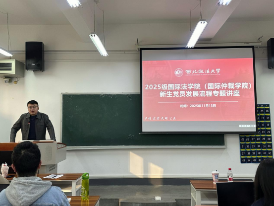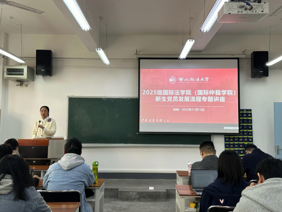为切实规范高校党员发展工作程序,帮助2025级新生准确把握党员发展标准,11月13日,国际法学院(国际仲裁学院)举办新生党员发展流程专题讲座。校党委组织部组织员樊丁以《赓续红色信仰,勇担青春使命》为题,为全体研究生新生明晰入党具体流程。辅导员何珊主持讲座,学院党委组织员韩潇,国际法学院全体研究生新生参加本次专题讲座。