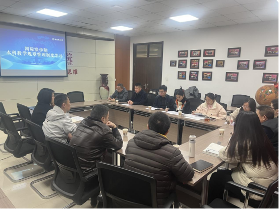 在本科教学管理工作的持续推进与深化进程中,国际法学院近期紧锣密鼓地召开了一系列重要会议,旨在全方位提升教学质量,筑牢教育基石。12月9日下午,本科教学规章管理制度学习、期末考试考前培训、专业建设专题工作等三项会议在学院会议室举行。学院领导班子成员、教研室主任、教务秘书、辅导员等参加了会议,会议由学院副书记吴晓娟主持。会议聚焦学校与学院的本科教学规章管理制度等,包括《本科教学教师工作规范》、《本科教学事故认定及处理办法》、《教研室考核管理办法(试行)》、《教研室主任工作职责》《关于推进考试改革加强考试管理的意见》等规范性文件。