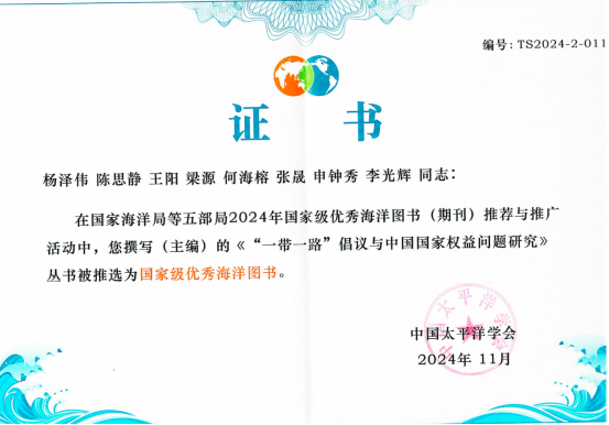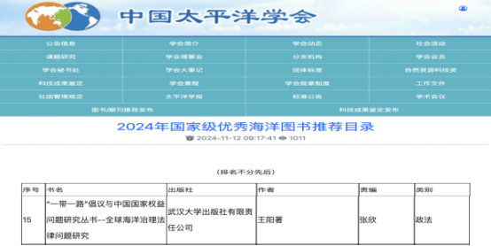 近日,在中国太平洋学会国家级优秀海洋图书推荐与推广活动中,我院教师王阳专著《全球海洋治理法律问题研究》被推选为2024年“国家级优秀海洋图书”。该活动是根据教育部、文化部、国家海洋局、国家文物局、国家新闻出版广电总局联合印发的《提升海洋强国软实力——全民海洋意识宣传教育和文化建设“十三五”规划》,经海洋主管部门同意实施的,为广大读者提供一批最好的,有价值的海洋读物。