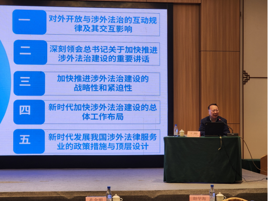 王瀚教授做了“推进高水平对外开放与加快涉外法治建设的战略性和紧迫性”的专题讲座,分别就对外开放与涉外法治的互动规律和交互影响、深刻领会习近平总书记涉外法治建设思想的精神蕴涵、新时代涉外法治建设的总体工作布局和发展高质量涉外法律服务业的政策措施和制度创新等问题做了深入阐释。