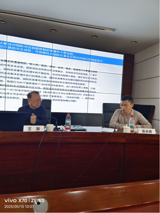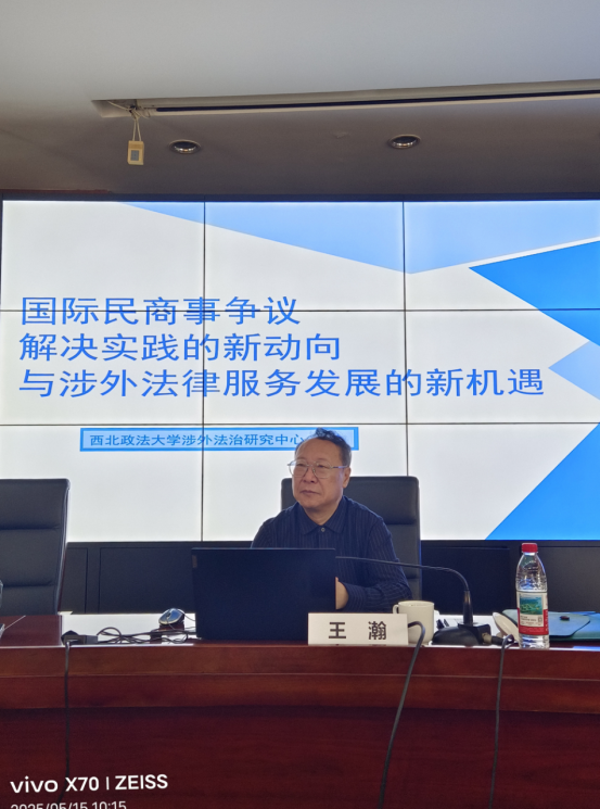 2025年5月15日上午,我校国际法学科带头人、国家智库研究基地执行主任、首席专家王瀚教授应邀为上海政法学院做主题为《国际民商事争议解决实践的新动向与涉外法律服务业发展的新机遇》。本次讲座由上海政法学院人工智能法学院、国际法学院,上海市法学会海洋法治研究会、上海市法学会人工智能法治研究会及上海市法学会“一带一路”法律研究会联合主办。人工智能法学院院长杨华教授主持讲座,国际法学院副院长吴永辉教授与谈,近百名师生现场聆听讲座。