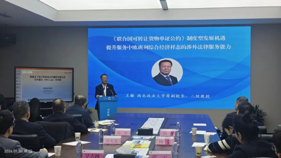 2026年1月30日下午,西部陆海新通道的规则交汇“软联通”——《联合国可转让货物单证公约》下铁路提单物权化的新变化研讨沙龙在“三个中心”举办。本次研讨沙龙由西安市司法局、西安市法学会、西安浐灞国际港管委会主办,西安市司法局“三个中心”办公室、市律协自贸区建设与国际物流专委会、北京大成(西安)律师事务所等多家单位联合承办。来自机关单位、法律服务机构、企业、高校、行业协会的60余名代表齐聚一堂,共话行业发展新机遇。最高人民法院国际商事专家委员会委员、我校国家智库研究基地涉外法治研究中心执行主任、首席专家王瀚教授应邀出席会议。