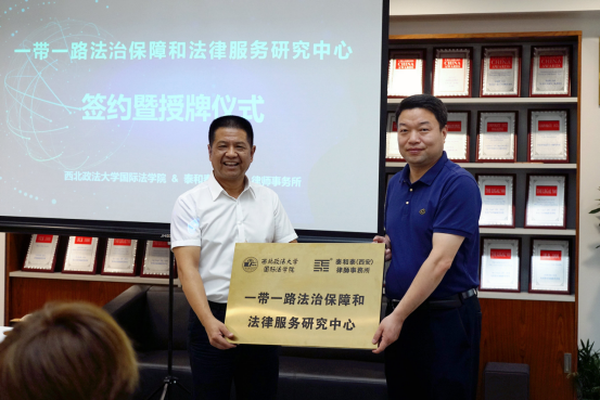 签约授牌仪式由陈平律师主持,刘亚军院长代表西北政法大学国际法学院向泰和泰(西安)律师事务所主任姚子奇授予了“一带一路法治保障和法律服务研究中心”的牌匾。随后,双方签署了《战略合作框架协议》。