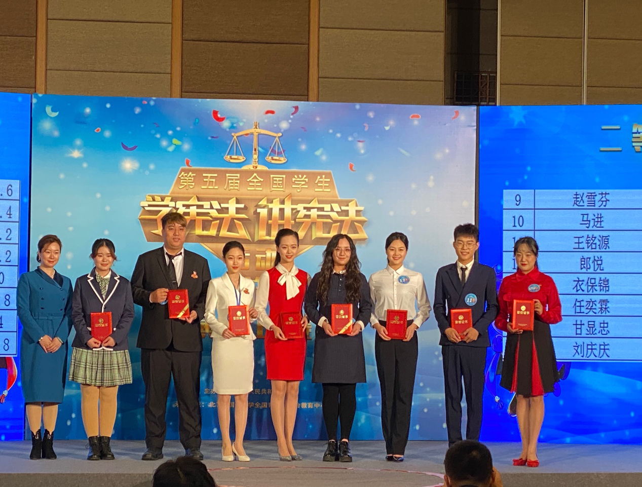 11月29日至12月3日,由教育部主办的第五届全国学生“学宪法、讲宪法”比赛在北京召开。来自全国34支代表队共263名选手齐聚一堂,大家以比赛的形式,讲述身边故事,普及宪法知识,弘扬宪法精神,树立宪法权威。西北政法大学国际法学院2017级涉外班的任奕霖同学以陕西省高校组第一名身份,代表陕西赴京参加此次比赛。经过激烈角逐,任奕霖同学最终荣获“第五届全国学宪法、讲宪法比赛”高校组二等奖的优异成绩,为陕西争了光,为学校争了光。
