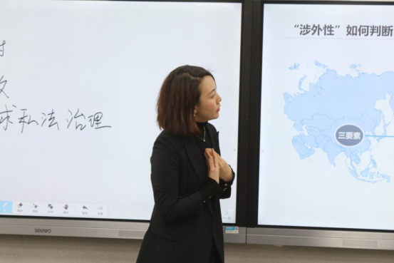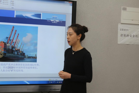 在潘俊武教授宣读比赛规则后,各位参赛教师以现场授课的方式对思政教学案例进行详细解析。王阳老师以“从专属经济区制度看《海洋法公约》与中国周边海洋问题”为主题,运用图表清晰地讲述了专属经济区形成的过程;尹海新老师就关于中国古代是否有国际法的问题及其结果对国家利益的影响展开论述;高媛老师将“冲突规范”作为主题,讲述中大量运用贴切的事例,以包容的视角进行了论述; 李捷音老师介绍了国际贸易术语的基本概念,对比分析了《国际贸易术语解释通则》的不同版本,揭示了国际贸易术语的趋势和变化规律;梁蓉老师讲述了“涉外性”的判断标准,介绍了国际私法的调整对象及涉外法律关系,选用了有代表性的案例,阐述了争议焦点及裁判结果。本次竞赛中李捷音老师和高媛老师荣获一等奖,王阳老师、尹海新老师和梁蓉老师荣获二等奖。
