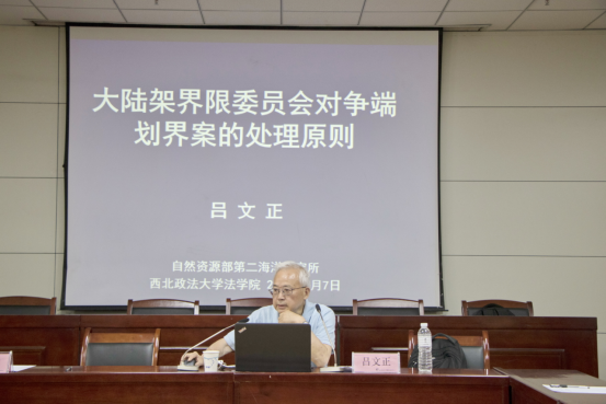 讲座伊始,吕文正委员阐述1982年《联合国海洋法公约》的重大意义,讲解了沿海国对大陆架拥有的权利、对大陆架外部界限划定的时限要求、划定方法等知识。之后,通过部分国家的划界实例讲解大陆架划界案的争端处理问题。吕文正委员于1997年3月当选为首届大陆架界限委员会委员,至2018年8月卸任时已在大陆架界限委员会任职21年,在讲解相关划界案时他结合自身的工作经验,清楚透彻地说明委员会处理争端划界案的法律依据、方法等。