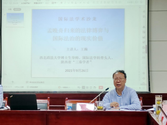 2021年9月25日,被美国、加拿大两国联手任意拘押近1300天的华为公司首席财务官孟晚舟女士终于返回祖国。为深入分析该案相关国际法律问题,9月26日晚,西北政法大学国际法学院在雁塔校区国际法学术报告厅举办“孟晚舟归来的法律博弈与国际法治的现实价值”学术沙龙,邀请博士生导师、国际法学科学术带头人、陕西省“三秦学者”王瀚教授主讲。国际法学院院长、博士生导师刘亚军教授主持沙龙,国际法学院张光教授、张望平副教授、刘学文副教授、周亚光副教授、王兆平博士、刘冰博士、宋瑞琛博士、时杜娟博士及硕博生近百人参加。