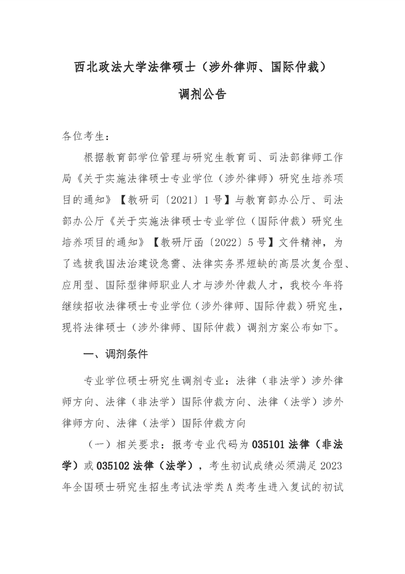 西北政法大学法律硕士(涉外律师、国际仲裁)调剂公告