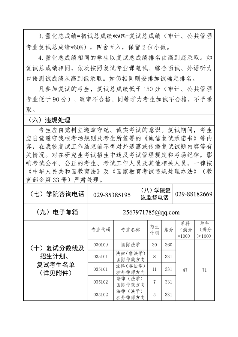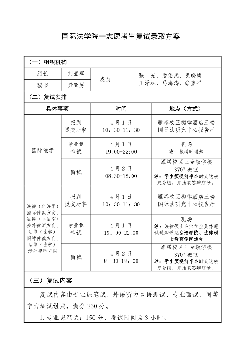 国际法学院一志愿考生复试录取方案