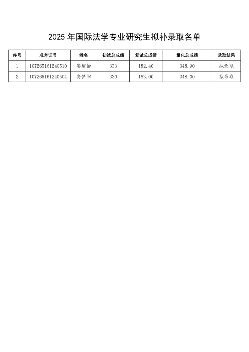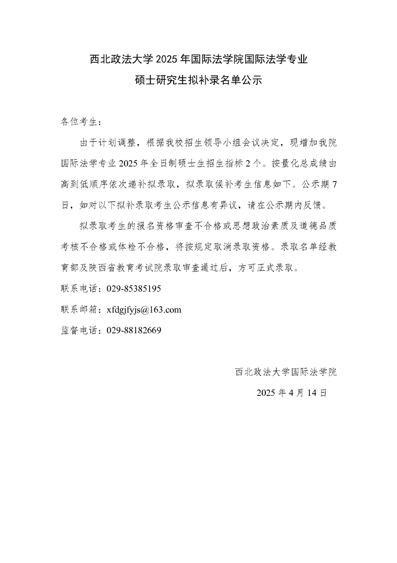 西北政法大学2025年国际法学院国际法学专业硕士研究生拟补录名单公示