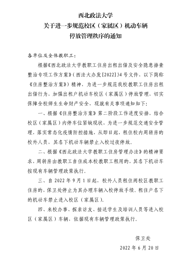 关于进一步规范校区(家属区)机动车辆停放管理秩序的通知
