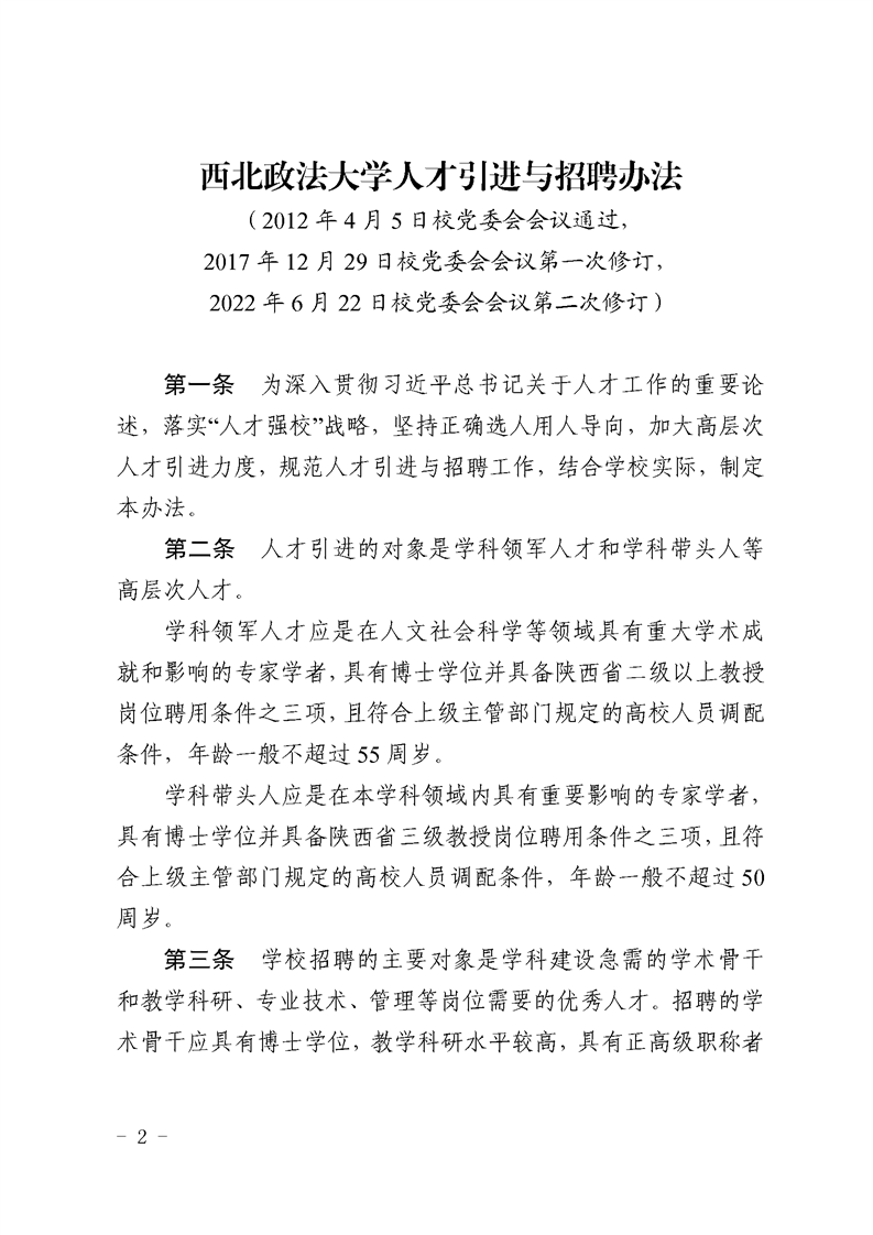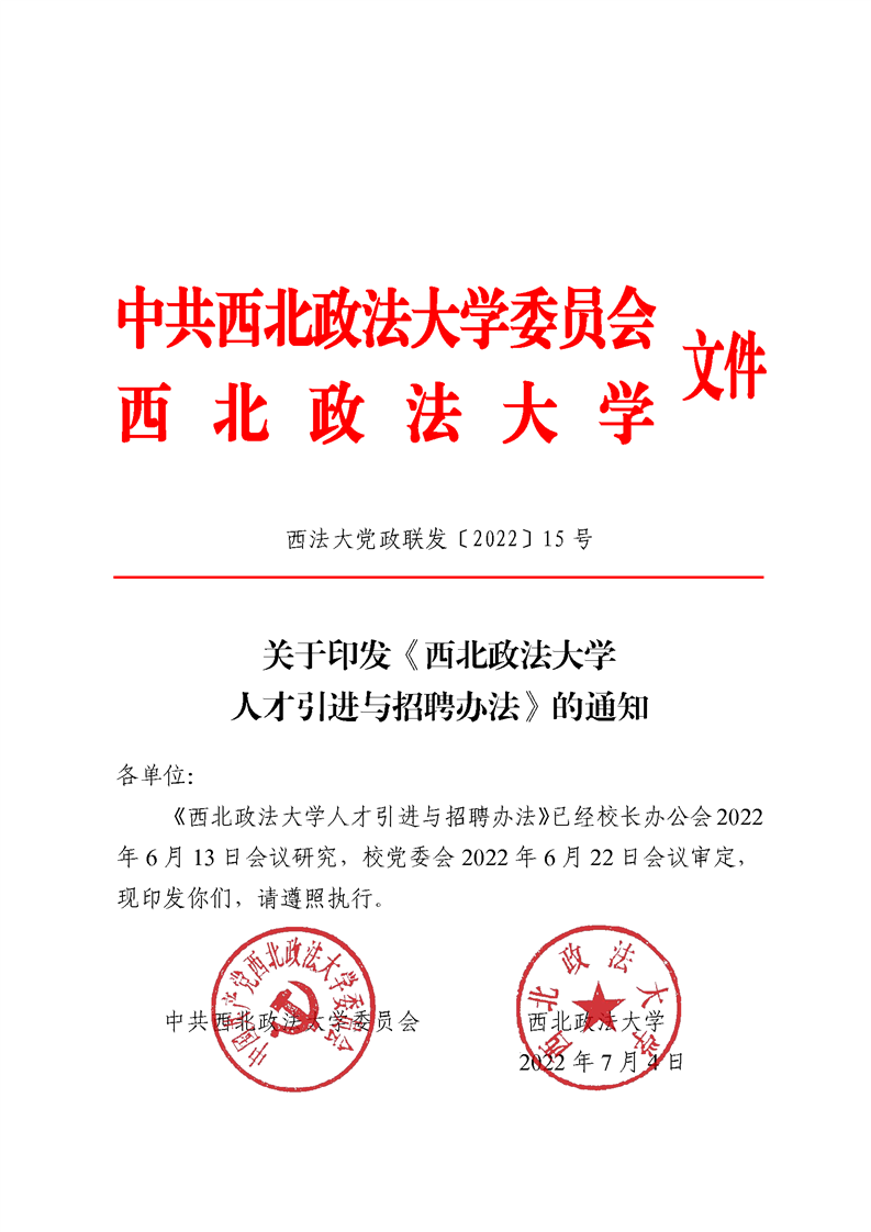 关于印发《西北政法大学人才引进与招聘办法》的通知