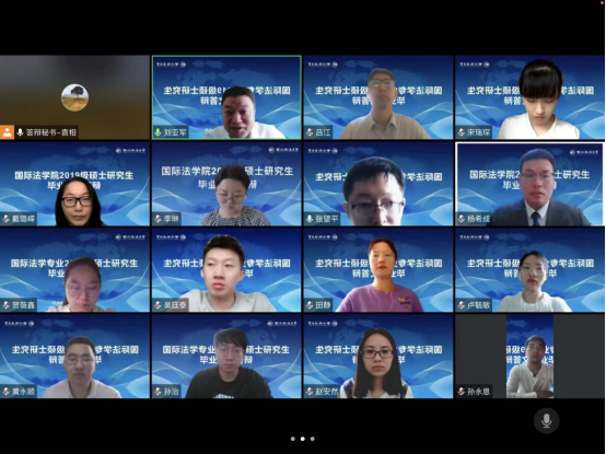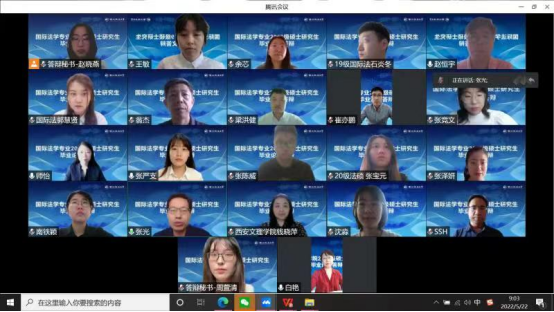 2022年5月22日8:30-18:30,国际法学院进行了2022届硕士研究生毕业论文答辩,因为疫情原因本次论文答辩采取线上线下相结合,同时进行的方式。为保障毕业工作有序平稳开展,尽可能降低疫情对毕业生的影响,学院按照学校要求成立答辩工作小组,积极准备、精心筹划,制订了详细的答辩工作方案。提前建立微信工作群,就答辩时间、答辩方式、答辩程序、注意事项等进行了细致的安排。依照研究生院对2022届硕士研究生毕业论文答辩的工作精神,学院最终确定对在校学生10人进行线下答辩,对未返校的学生39人(含法硕学院19人)进行线上答辩(腾讯会议)。5位硕导参加线下答辩,17位硕导参加线上答辩,同时线上答辩邀请了三位校外专家,分别为西安交通大学丁卫副教授、西安建筑科技大学刘莉教授、西安文理学院钱晓萍教授。